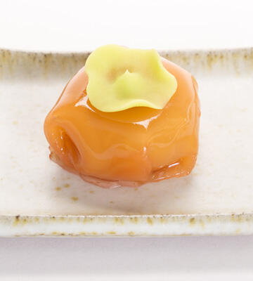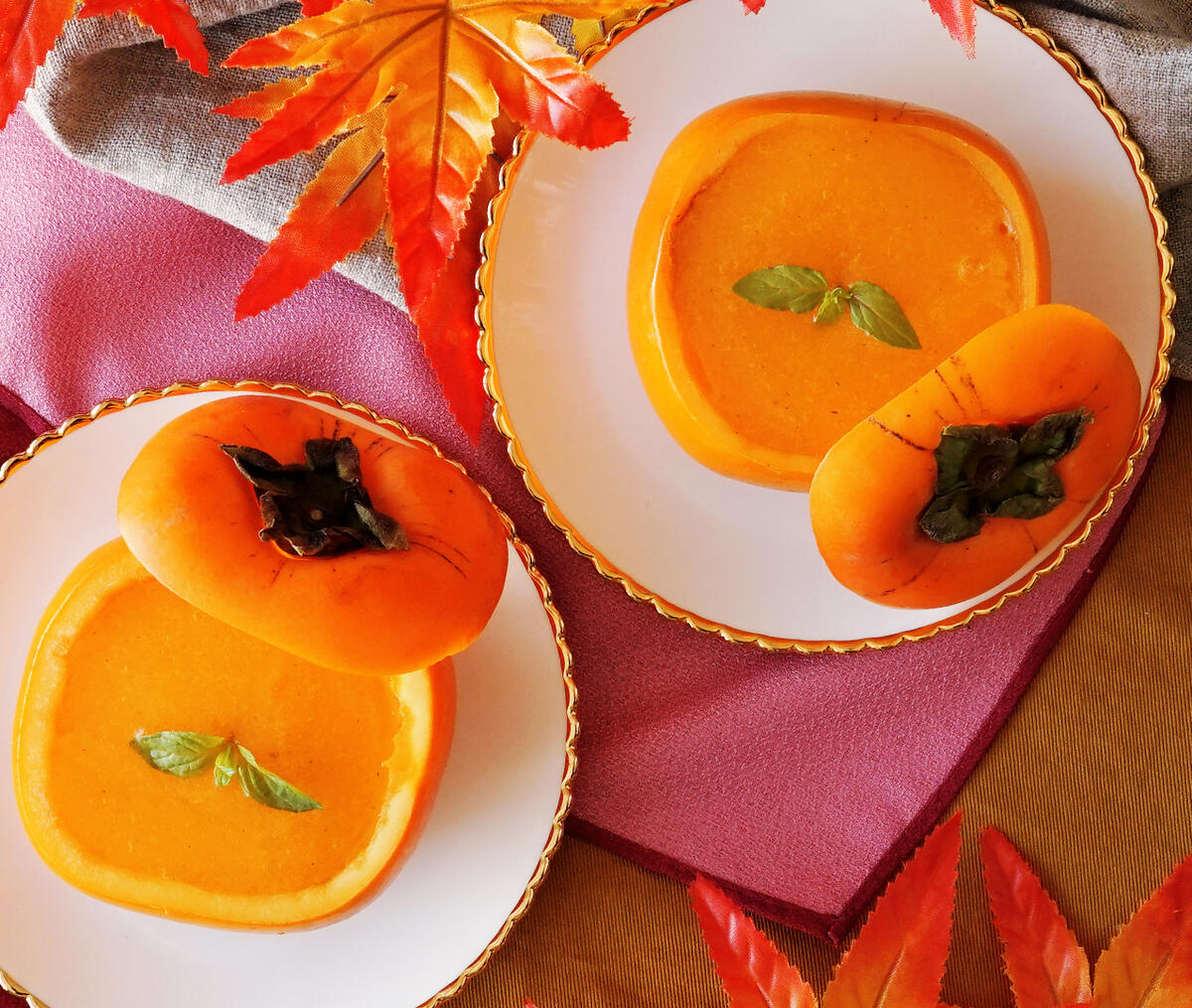 A wonderful dessert made with persimmon juice and puree. It is like biting into a citrussy cloud, a sensation between jelly and custard. Simply sweet, cool, and refreshing.