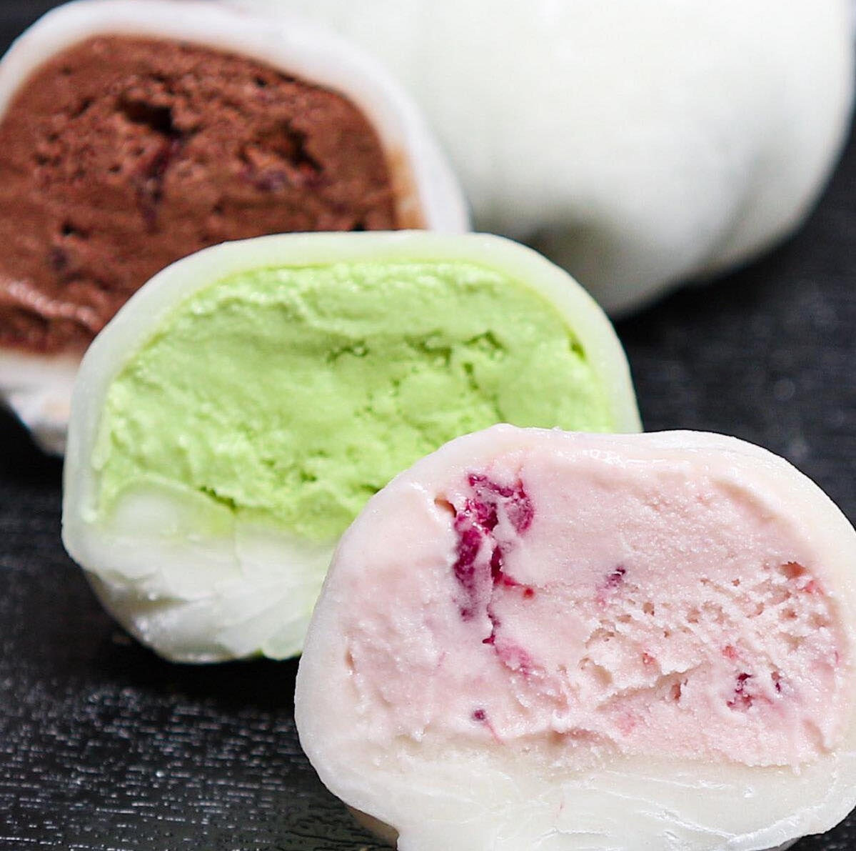 Homemade ice cream that has been wrapped in mochi skin. Enjoy a variety of flavors: chocolate, rolanberry, custard, matcha, adzuki bean, and black sesame.