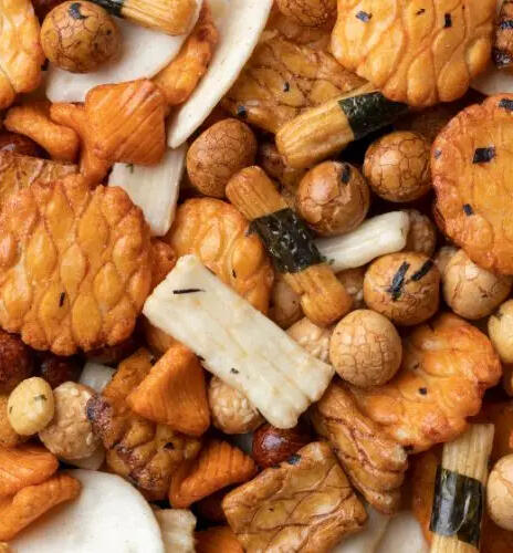 A variety of fried rice crackers with unique flavors, textures, and ingredients that combine sweet, salty, and savory tastes.