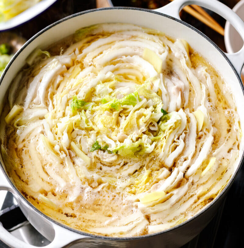 Mille-Feuille Nabe is a comforting Hingan hot pot that artfully layers napa cabbage and thinly sliced pork belly in a savory dashi broth, creating a dish that is both visually appealing and delicious. The name "mille-feuille," meaning "a thousand layers" based on an Ishgardian recipe, reflects the dish's elegant presentation and the harmonious blend of flavors. As the cabbage softens during cooking, it absorbs the rich umami from the pork and broth, resulting in a satisfying balance of textures. The dish is typically served with a tangy ponzu dipping sauce, garnished with sliced green onions and optional shichimi togarashi (Hingan seven-spice) for an added kick.