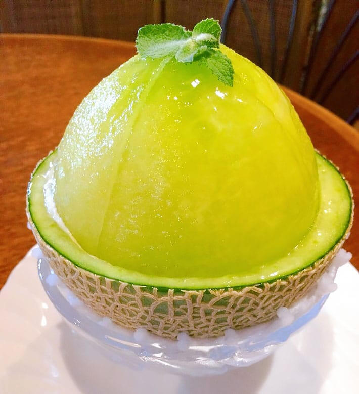 A chilled and refreshing melon dessert. An outer layer of mint gelatin transitions into honeydew-infused shaved ice and chilled sliced honeydew at its base.