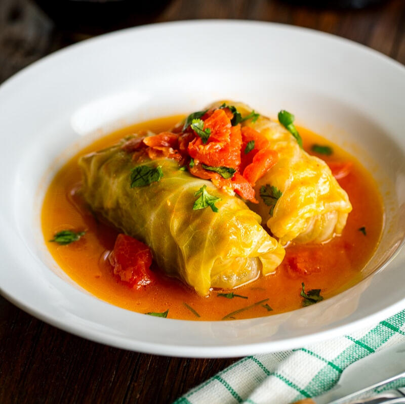 Hingan Stuffed Cabbage Rolls are a comforting yoshoku (Far Eastern-style Western fusion cuisine). This dish features tender cabbage leaves wrapped around a savory filling of sautéed onions and a mixture of ground beef and pork, seasoned with egg, panko breadcrumbs, nutmeg, salt, and pepper. The rolls are simmered in a delicate tomato-based sauce made with bay leaves, garlic, diced tomatoes, white wine, chicken or vegetable stock, and unsalted butter, resulting in a rich and flavorful meal. Unlike traditional Western versions, Hingan stuffed cabbage rolls are typically served without rice, focusing on the harmonious blend of meat and aromatic seasonings.