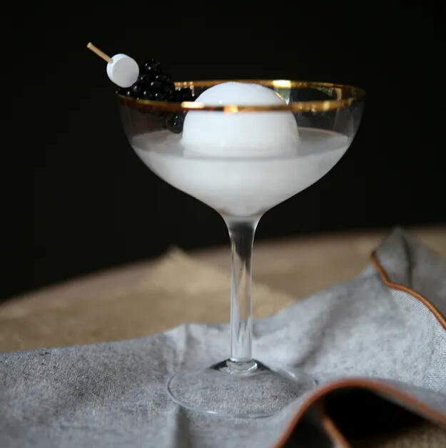 The Full Moon is a simple but elegant martini. It has a vodka base topped with coconut cream, distilled water, blackberries, and a sugar rim. The moon-shaped ice cube finishes the look.