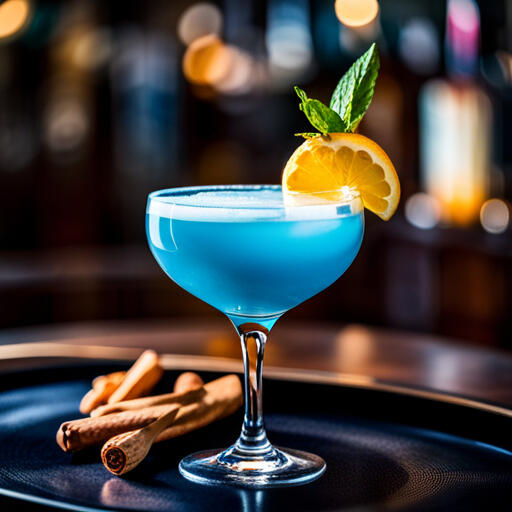 Once In A Blue Moon is a refreshing martini. Blue curacao is the leading player, but the high-quality gin lends piney and citrus tones, which draw out its citrus, natural sweetness, and bitter notes. It is then garnished with a star fruit slice, mint leaves, and orange peel twist.